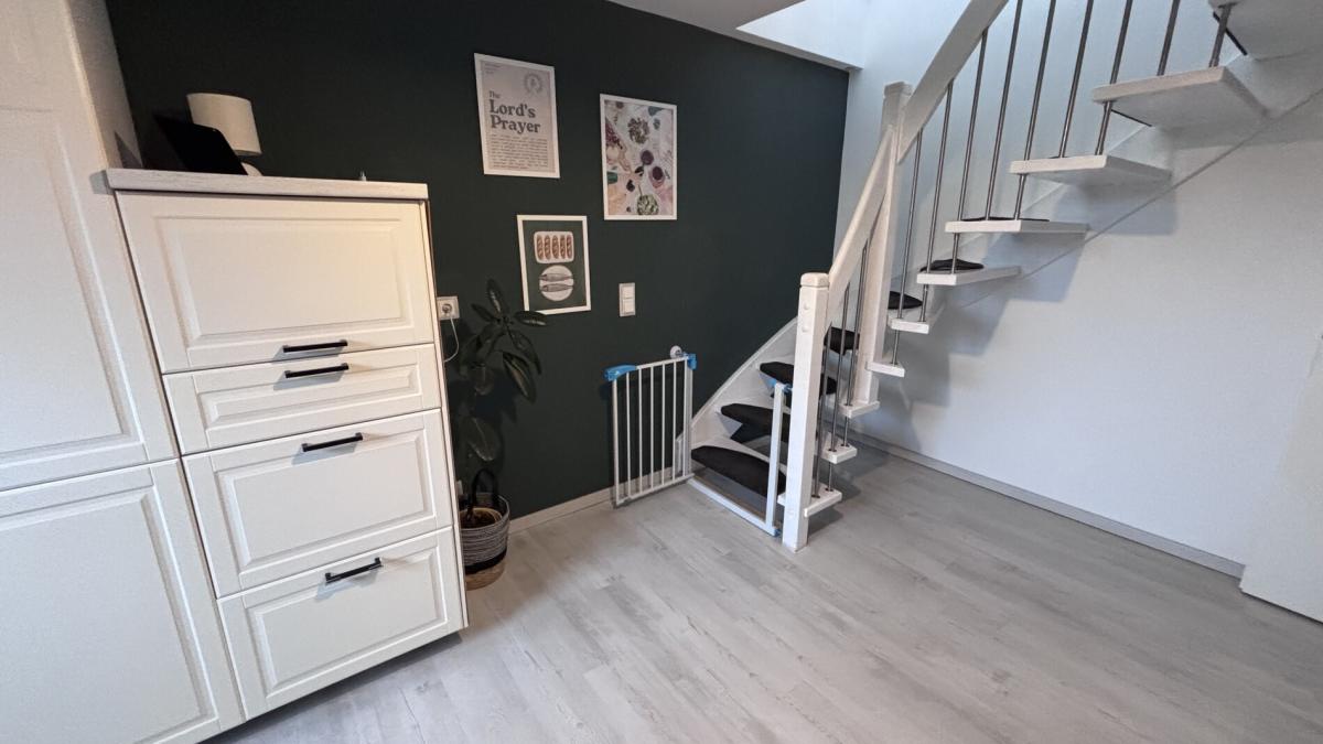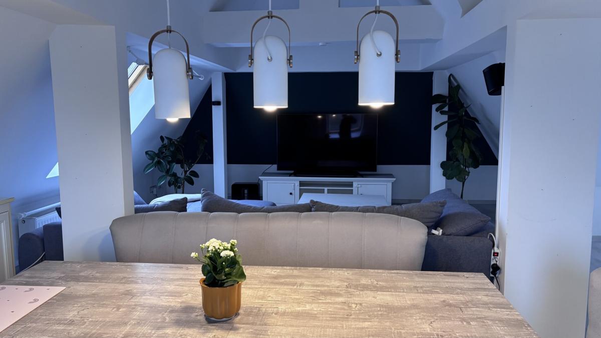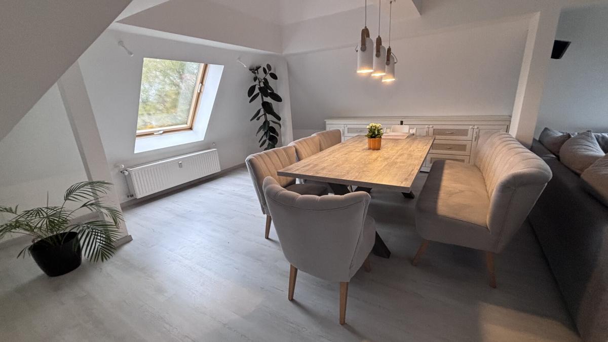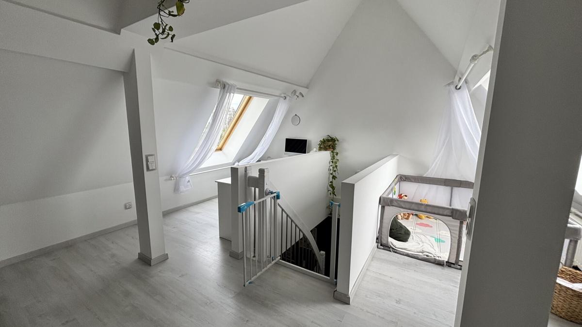 Im Dachgeschoss finden Sie ein großzügiges Schlafzimmer, ein Kinderzimmer, ein stilvoll gestaltetes Badezimmer sowie ein praktisches Gäste-WC. Die moderne Küche lädt zum Kochen und Genießen ein. Ein Highlight ist der offene Wohn- und Essbereich im lichtdurchfluteten, ausgebauten Spitzboden, ideal für gesellige Abende oder entspannte Stunden.