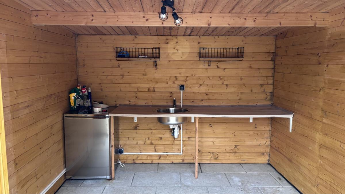 Die Küche, Gartenlaube (Holz) und Loungemöbel sind im Kaufpreis enthalten.